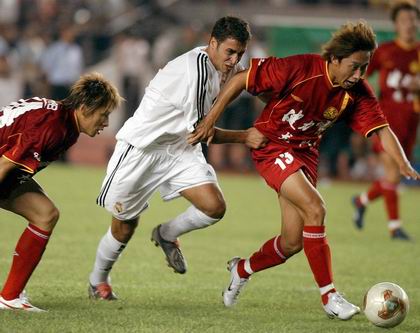北京时间8月2日晚上,皇马在工体4-0大胜龙队。图为比赛中劳尔与王霄拼抢中暗使小动作。